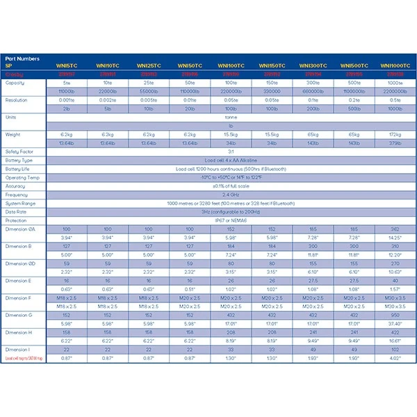 | Type | WLL (t) | Resolutie | Afmetingen Cell Ø x H (mm) | Afmetingen zadel Ø x H (mm) | Frequentie | Nauwkeurigheid | Gewicht (kg) |